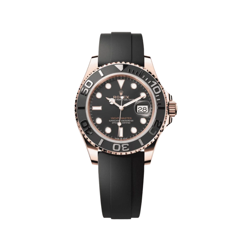 This luxury automatic sport watch combines a refined rose gold finish with a striking black ceramic-style bezel, creating a powerful and modern aesthetic.